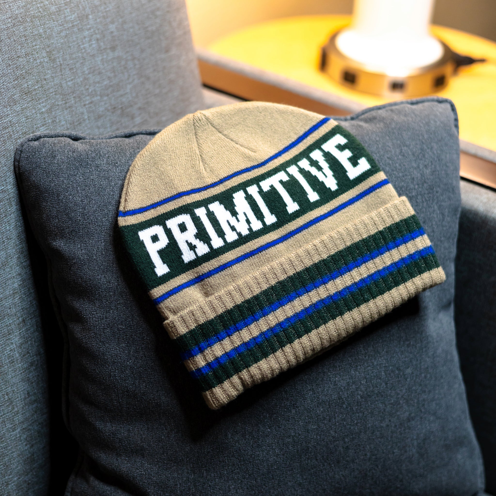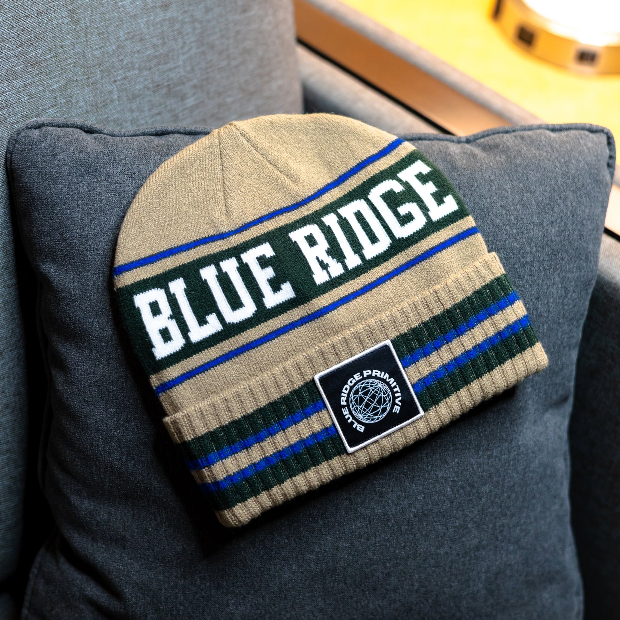 Classic cuffed beanie with signature style. Khaki base featuring premium black and royal blue stripes. Knit construction for everyday comfort.